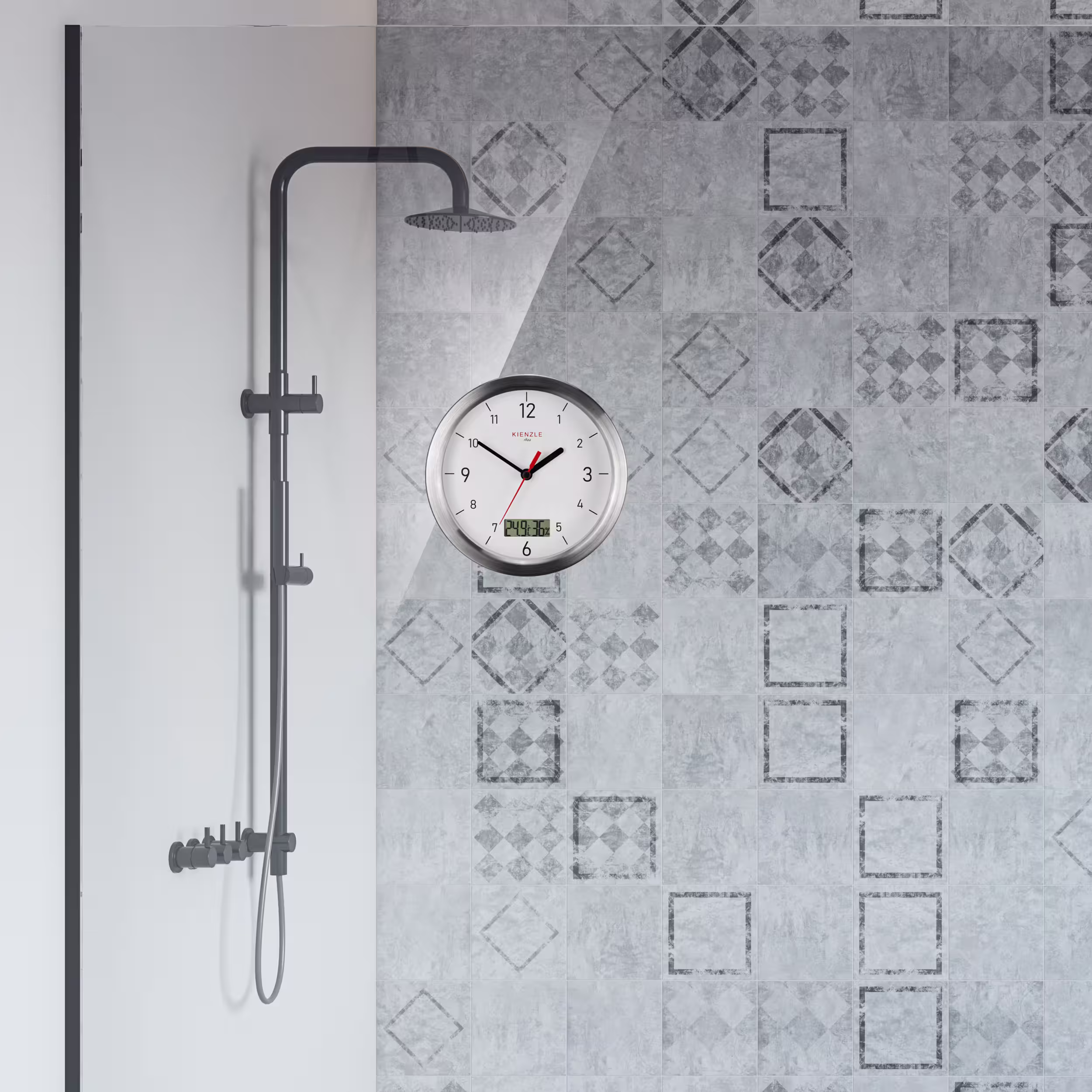 The KIENZLE DCF bathroom clock with integrated thermo-hygrometer will quickly become an indispensable accessory in your bathroom. It features automatic time setting via DCF signal and a digital display for temperature and humidity. Thanks to its understated design, the timepiece blends seamlessly into any interior style. As a long-established German brand, KIENZLE has always stood for precision and excellent quality, qualities that also characterize this bathroom clock.