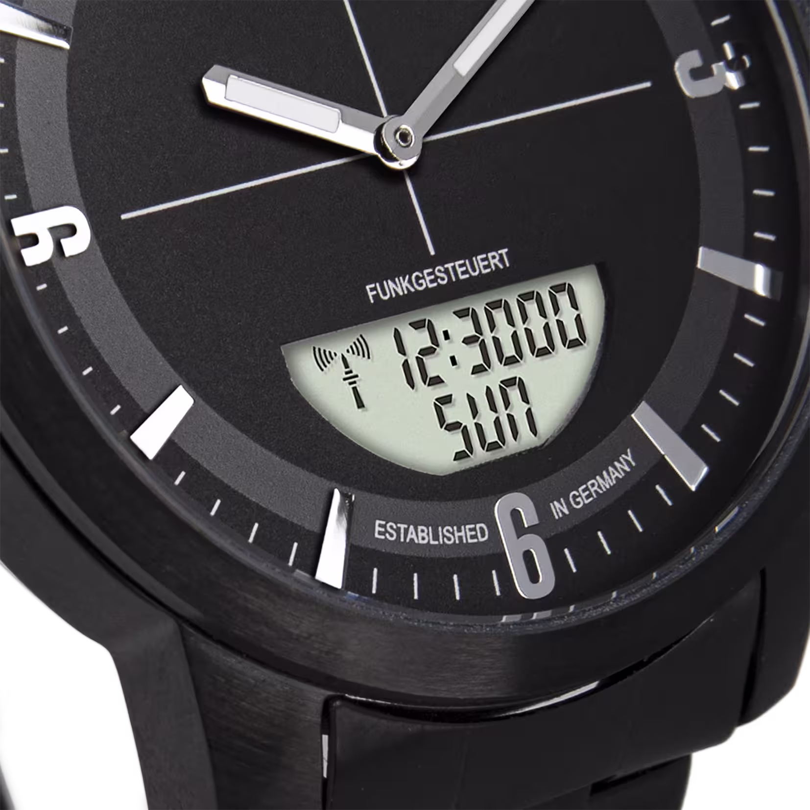 German radio technology ensures consistently accurate timekeeping (transmitting station near Frankfurt am Main, signal range approx. 1500 km) and automatic switching between summer and winter time.