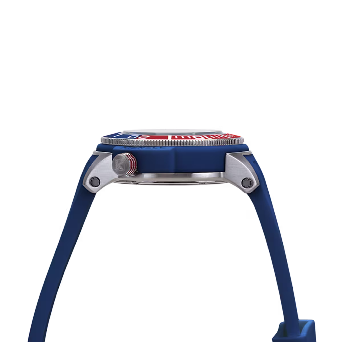 The Kienzle Poseidon24 is a diver's watch that combines sporty design and reliability. With its 45 mm satin-finished steel case, rotating bezel, white silicone strap, and water resistance up to 15 ATM, it is the ideal companion for any adventure, both on and off land.