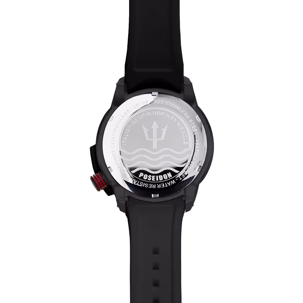 The Poseidon 24 is a diver's watch designed for reliable performance under extreme conditions. Its 45 mm satin-finished steel case houses a highly legible dial, protected by a shock- and scratch-resistant mineral glass with an anti-reflective sapphire coating. The unidirectional rotating bezel and crown at 4 o'clock ensure optimal functionality while diving. Powered by the Japanese Miyota 2115 movement.