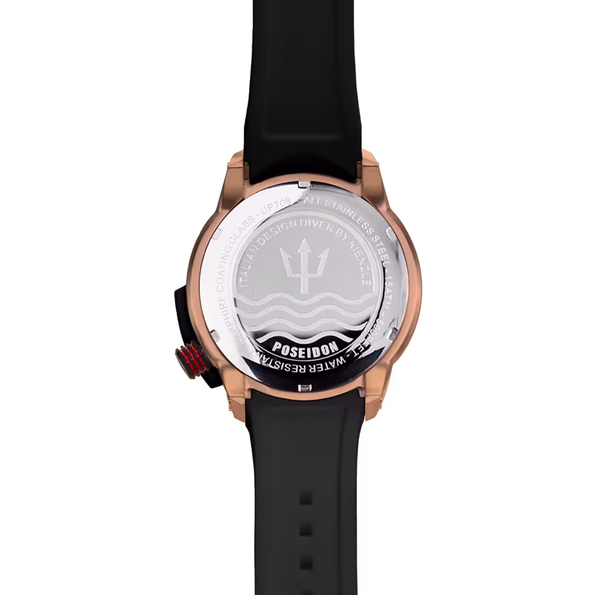 The Poseidon 24 is a diver's watch designed for reliable performance under extreme conditions. Its 45 mm satin-finished steel case houses a highly legible dial, protected by a shock- and scratch-resistant mineral glass with an anti-reflective sapphire coating. The unidirectional rotating bezel and crown at 4 o'clock ensure optimal functionality while diving. Powered by the Japanese Miyota 2115 movement.
