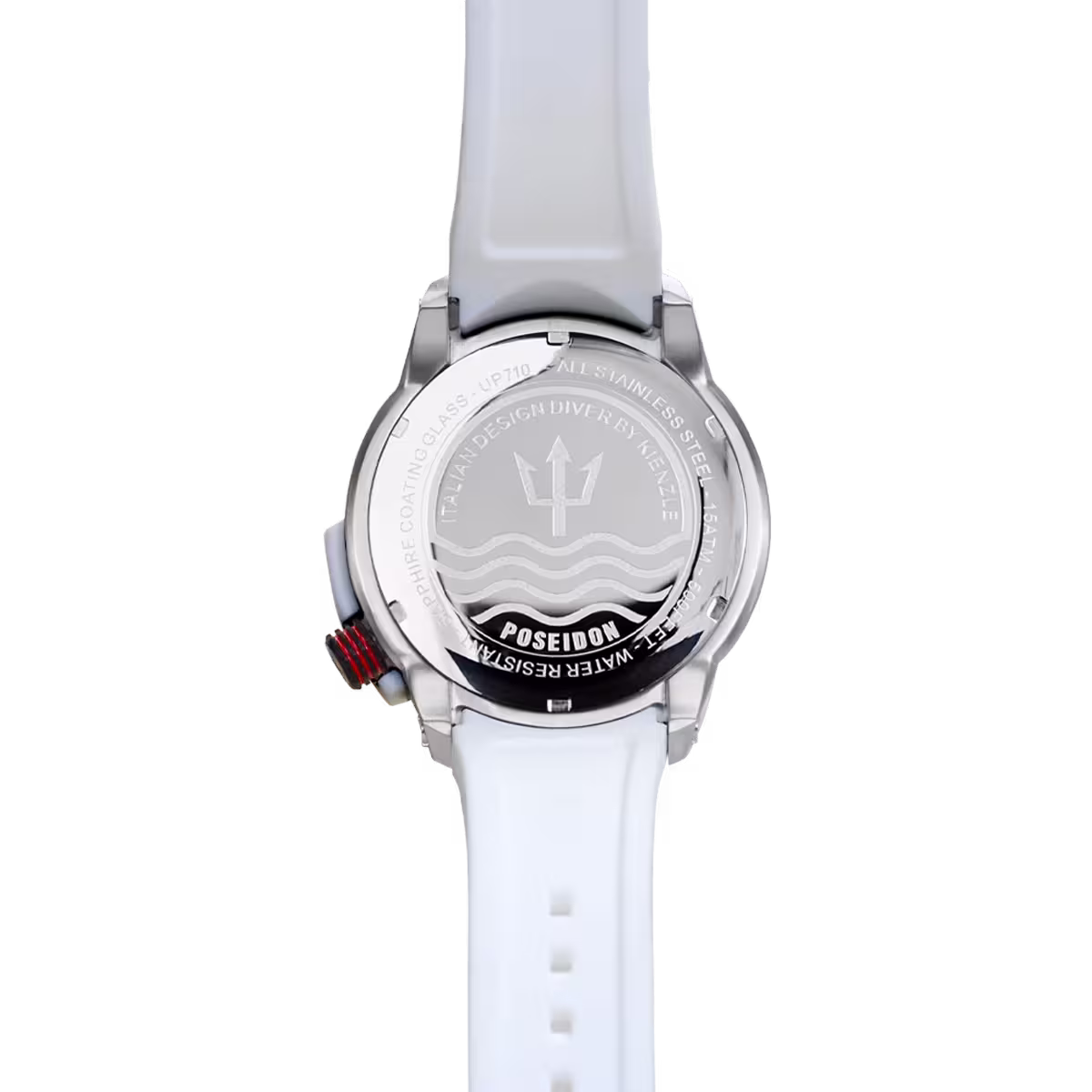 The Kienzle Poseidon24 is a diver's watch that combines sporty design and reliability. With its 45 mm satin-finished steel case, rotating bezel, white silicone strap, and water resistance up to 15 ATM, it is the ideal companion for any adventure, both on and off land.