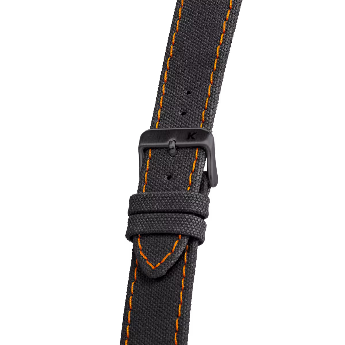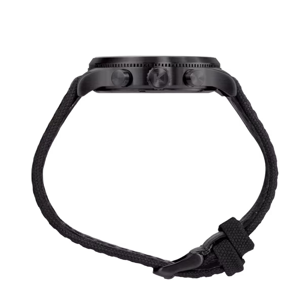 The 45 mm brushed steel case with black-plated surfaces houses a matte black dial with a date display at 4 o'clock and luminescent indices and hands for optimal legibility in all lighting conditions. The Miyota 6SA2 chronograph movement features four subdials: hours, minutes, seconds, and a retrograde chronograph with a 1/20-second display – ideal for precise timekeeping. Scratch-resistant sapphire glass and water resistance up to 10 ATM ensure robustness and durability. The Italian-made Cordura and Lorica strap completes the watch's sporty yet elegant look.